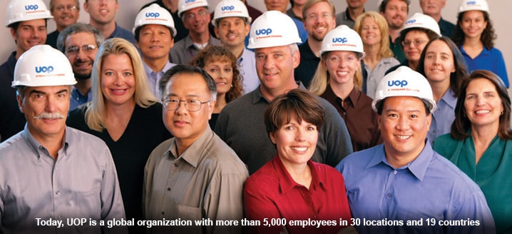 Today, UOP is a worldwide organization with more than 5,000 people working in 30 offices and plants located in 19 countries. UOP continues to invest in research and development, operating the world’s leading centers of research for the catalytic processing of hydrocarbons. Scientists and engineers from around the world are inventing better ways to convert oil, natural gas, coal and biomass into the fuels and chemicals required to support the growth and well-being of our world, while keeping the air and water we depend on clean.