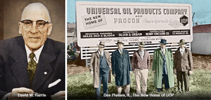 Having lost half of its engineers, surviving on a slim diet of engineering projects and with few prospects, UOP recruited the affable president of the Arkansas Natural Gas Corporation David W. Harris to run the company. Harris proved to be an exceptional diplomat, holding plaintiffs at bay while negotiating a handful of new deals to keep the company afloat.